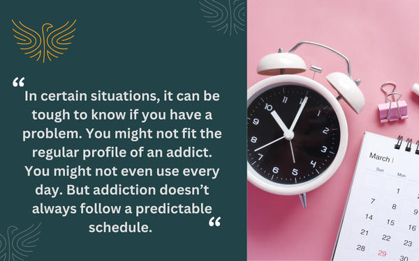 In certain situations, it can be tough to know if you have a problem. You might not fit the regular profile of an addict. You might not even use every day.